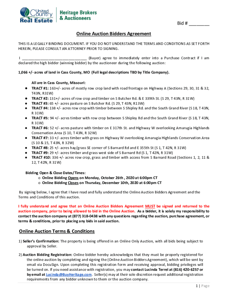 Bid # ___ Online Auction Bidders Agreement THIS IS A LEGALLY BINDING DOCUMENT. IF YOU DO NOT UNDERSTAND THE TERMS AND CONDITIONS AS SET FORTH HEREIN, PLEASE CONSULT AN ATTORNEY PRIOR TO SIGNING. I