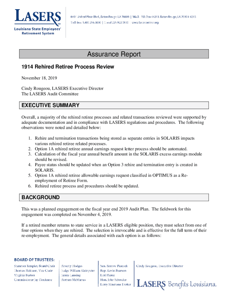Assurance Report 1914 Rehired Retiree Process Review November 18, 2019, Cindy Rouge, LASERS Executive Director The LASERS Audit CommitteeEXECUTIVE SUMMARY Overall, a majority of the rehired retiree