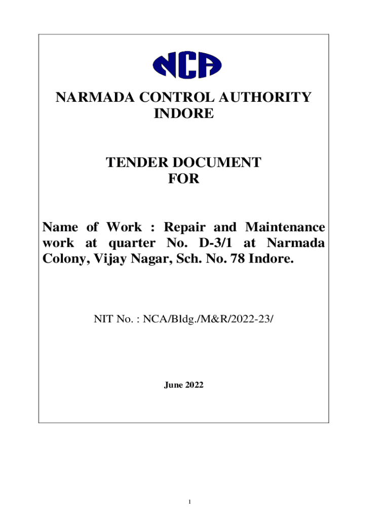 NARMADA CONTROL AUTHORITY INDORETENDER DOCUMENT Forename of Work : Repair and Maintenance work at quarter No. D3/1 at Narmada Colony, Vijay Nagar, Sch. No. 78 Indore. NIT No. NCA/Bldg./M&R/202223/June