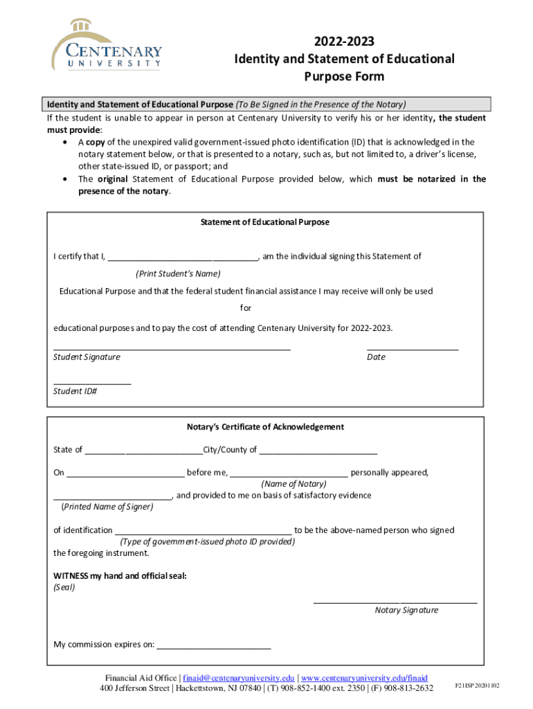 20222023 Identity and Statement of Educational Purpose Form Identity and Statement of Educational Purpose (To Be Signed in the Presence of the Notary) If the student is unable to appear in person