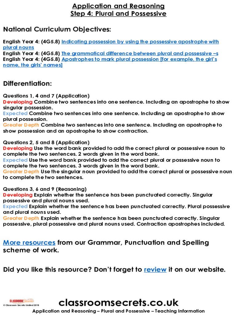 Get the free Year 5 Plural and Possessive Application and Reasoning