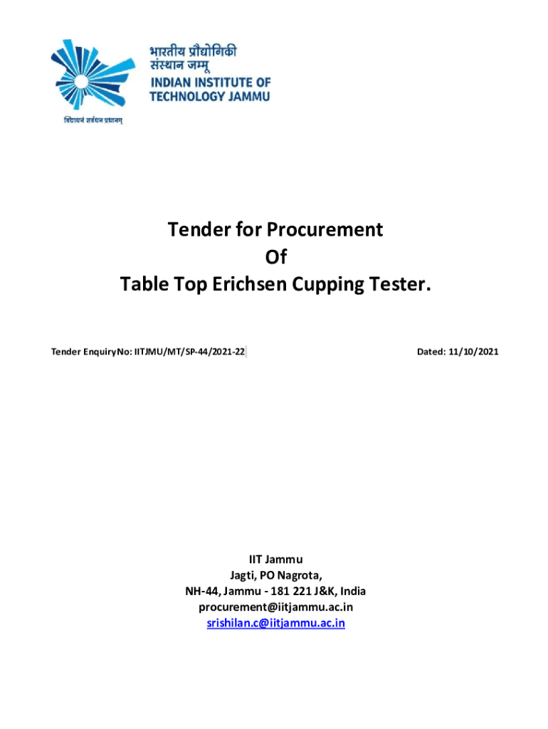 Tender for Procurement Of Table Top Erich sen Cupping Tester. Tender Inquiry No: ITEMS/MT/SP44/202122IIT Jammy Jagti, PO Nag rota, NH44, Jammy 181 221 J&K, India procurement@iitjammu.ac.in srishilan.c@iitjammu.ac.inDated: