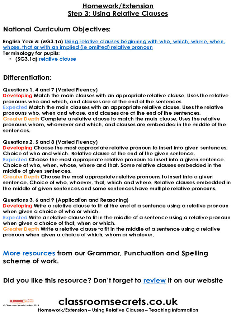 Homework/Extension Step 3: Using Relative Clauses National Curriculum Objectives: English Year 5: (5G3.1a) Using relative clauses beginning with whom, which, where, when, whose, that or with an implied