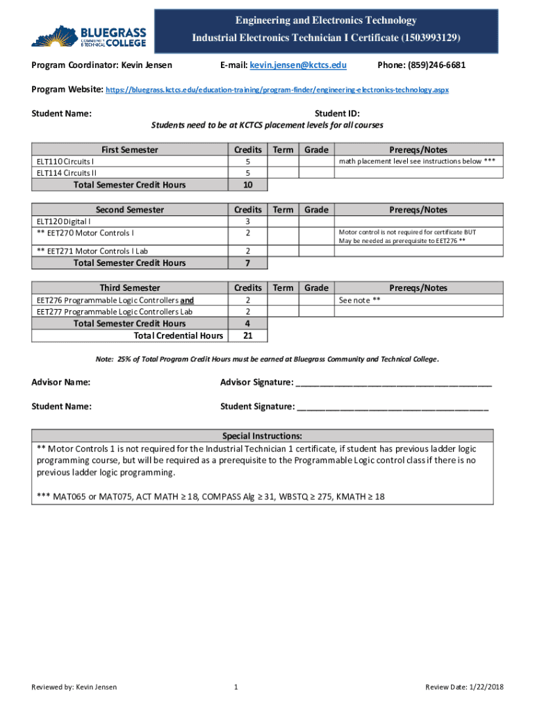 Get the free Industrial Electronics Technician I - CertificateKCTCS