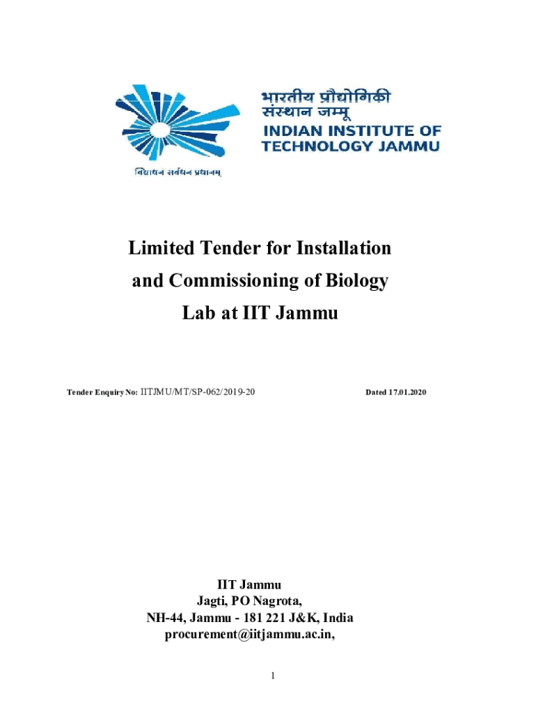 Limited Tender for Installation and Commissioning of Biology Lab at IIT JammuTender Inquiry No: ITEMS/MT/SP062/201920Dated 17.01.2020IIT Jammy Jagti, PO Nag rota, NH44, Jammy 181 221 J&K, India procurement@iitjammu.ac.in,
