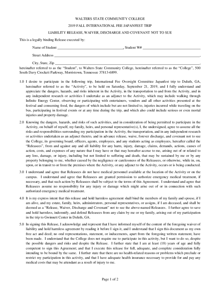WALTERS STATE COMMUNITY COLLEGE 2019 FALL INTERNATIONAL FEE JAPANESE TRIP LIABILITY RELEASE, WAIVER, DISCHARGE AND COVENANT NOT TO SUE This is a legally binding Release executed by: Name of Student,