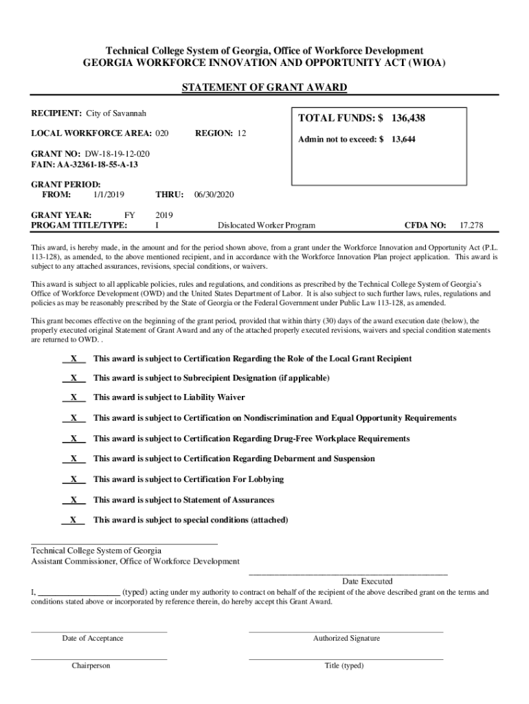 Technical College System of Georgia, Office of Workforce Development GEORGIA WORKFORCE INNOVATION AND OPPORTUNITY ACT (WHOA) STATEMENT OF GRANT AWARD RECIPIENT: City of SavannahTOTAL FUNDS: $136,438LOCAL