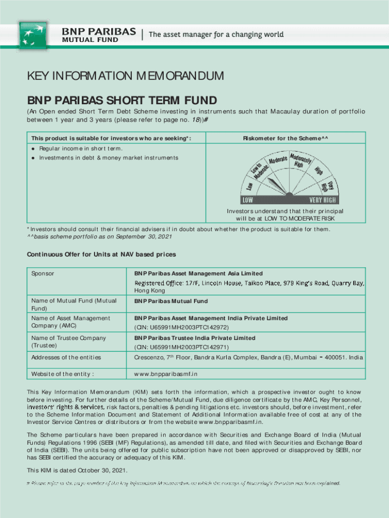 KEY INFORMATION MEMORANDUM BNP PARIBAS SHORT TERM FUND (An Open ended Short Term Debt Scheme investing in instruments such that Macaulay duration of portfolio between 1 year and 3 years (please refer