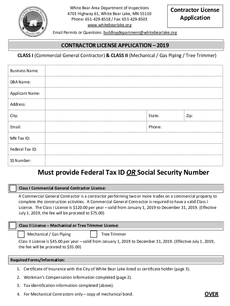 White Bear Area Department of Inspections 4701 Highway 61, White Bear Lake, MN 55110 Phone: 6514298518 / Fax: 6514298503 www.whitebearlake.orgContractor License ApplicationEmail Permits or Questions: