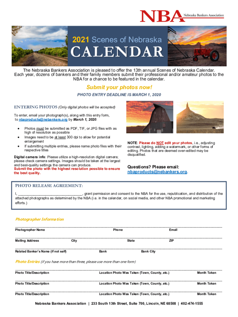 2021 Scenes of NebraskaCALENDAR The Nebraska Bankers Association is pleased to offer the 13th annual Scenes of Nebraska Calendar. Each year, dozens of bankers and their family members submit their