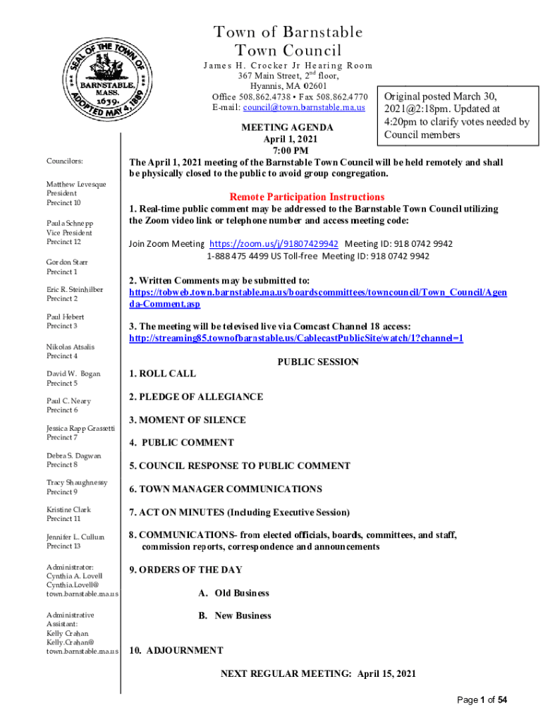 Town n of Barnstable e To own Council James H. Crocker Jr Hearing Room 367 Main Street, 2nd floor, Hannes, H MA 002601 Office 508.862.4738 F ax 508.862.47770 Email: COU uncil@town.bbarnstable.ma.USC