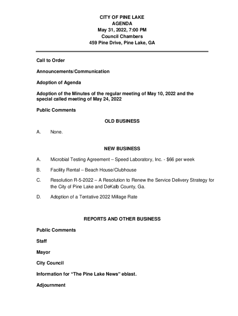 CITY OF PINE LAKE AGENDA May 31, 2022, 7:00 PM Council Chambers 459 Pine Drive, Pine Lake, Bacall to Order Announcements/Communication Adoption of Agenda Adoption of the Minutes of the regular meeting