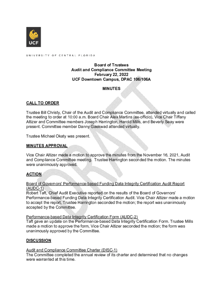 Board of Trustees Audit and Compliance Committee Meeting February 22, 2022, UCF Downtown Campus, PAC 106/106A MINUTES CALL TO ORDER Trustee Bill Christy, Chair of the Audit and Compliance Committee,