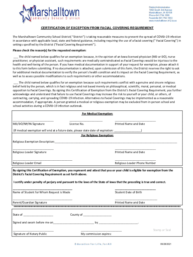 District Administration 1002 South 3rd Avenue Marshalltown, IA 50158 Phone 641.754.1000 Facsimile 641.754.1003 www.marshalltown.k12.ia.usCERTIFICATION OF EXCEPTION FROM FACIAL COVERING REQUIREMENT