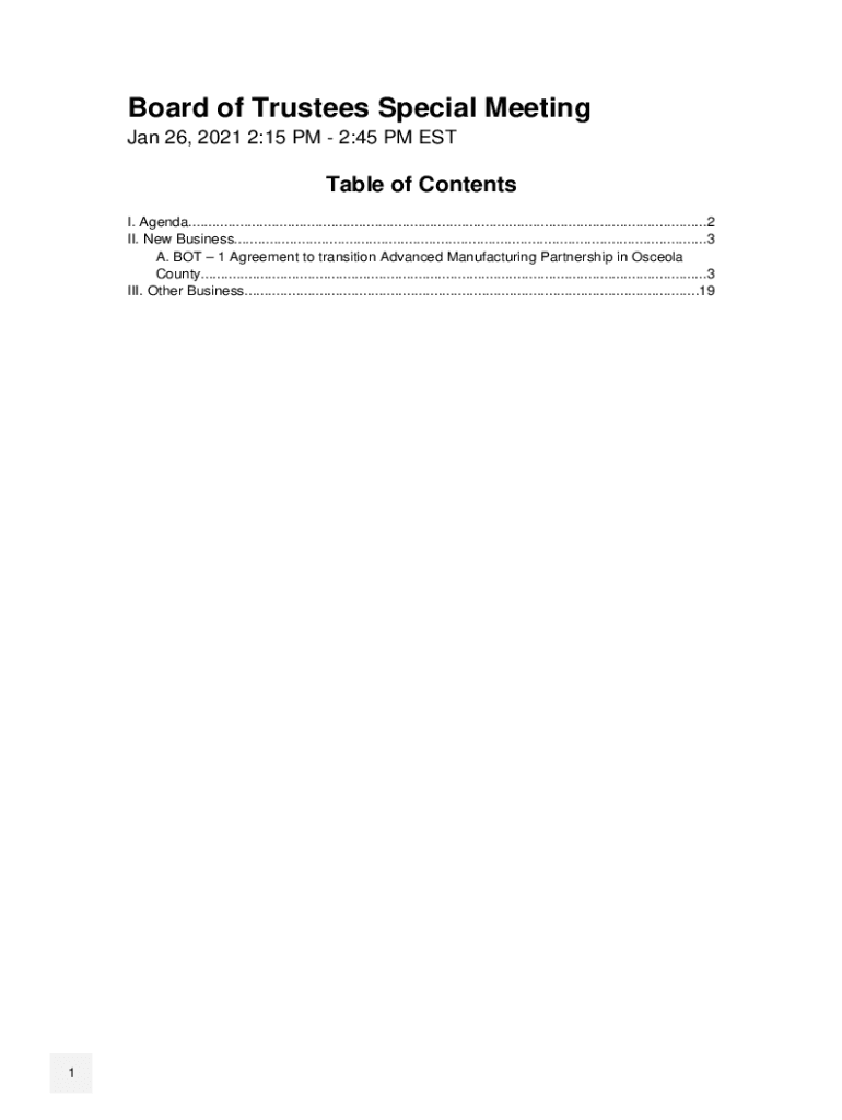 Board of Trustees Special Meeting Jan 26, 2021 2:15 PM 2:45 PM Stable of Contents I. Agenda...................................................................................................................................2