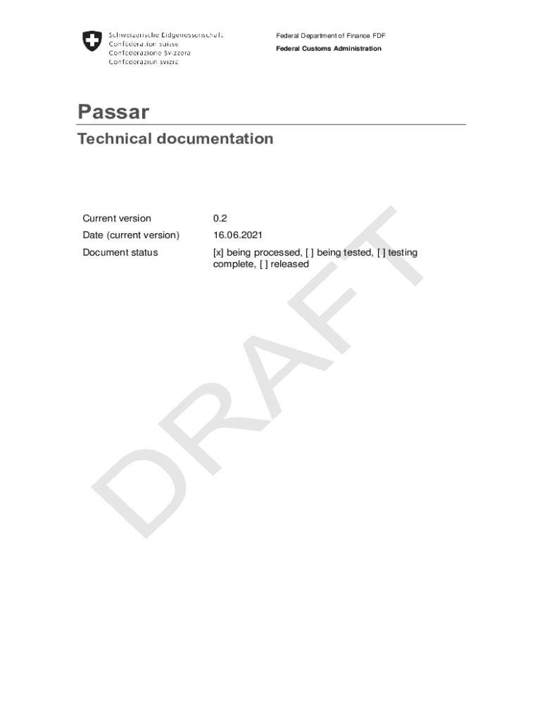Federal Department of Finance FDF Federal Customs AdministrationPassar Technical documentationCurrent version0.2Date (current version)16.06.2021Document status[x] being processed, [ ] being tested,