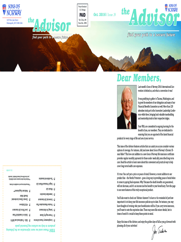 Presort Standard U.S. Postage1455 West Lake Street Minneapolis, MN 554082666 www.sonsofnorway.comAdvisorthefind your path to a secure futurePAID Twin Cities, MN Permit No. 2898Oct. 2016 / Issue 39Advisorthefind