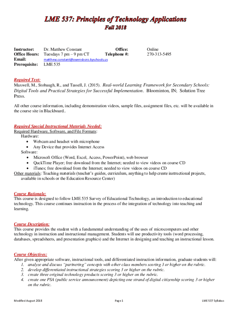 Instructor: Office Hours: Email: Prerequisite:Dr. Matthew Constant Tuesdays 7 pm 9 pm Office: Telephone #:Online 2703135495matthew.constant@owensboro.kyschools.usLME 535Required Text: Maxwell, M.,