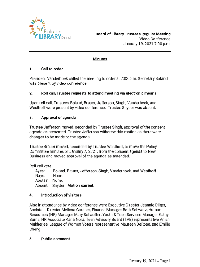 Board of Library Trustees Regular Meeting Video Conference January 19, 2021 7:00 p.m. Minutes 1. Call to orderPresident Vanderhoek called the meeting to order at 7:03 p.m. Secretary Poland was present