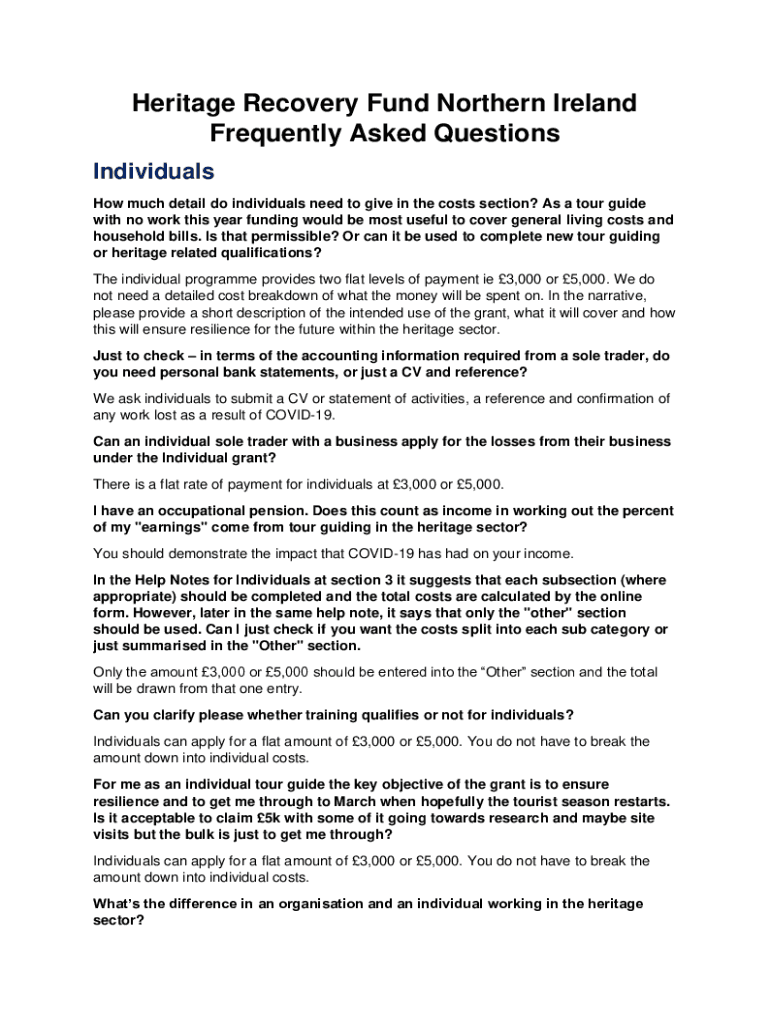 Heritage Recovery Fund Northern Ireland Frequently Asked Questions Individuals How much detail do individuals need to give in the costs section? As a tour guide with no work this year funding would