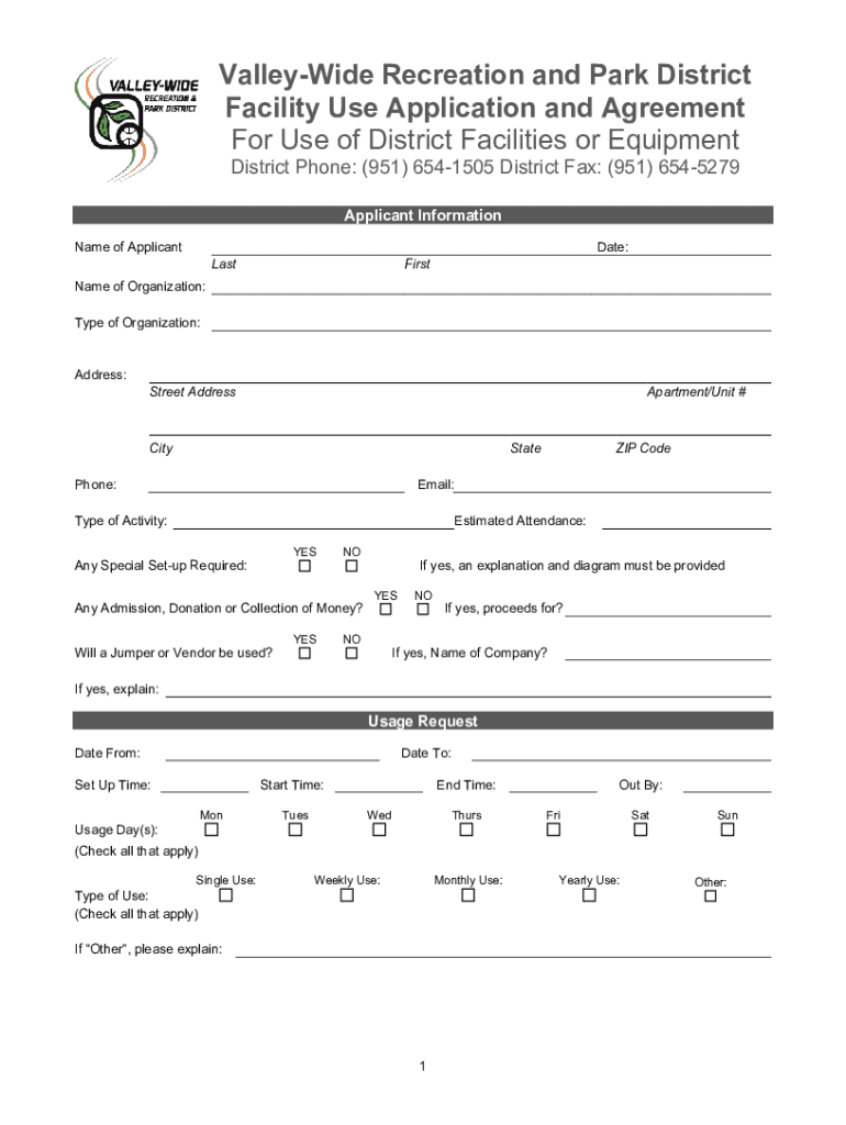 Obtain a copy of the facility use agreement form from the appropriate entity.