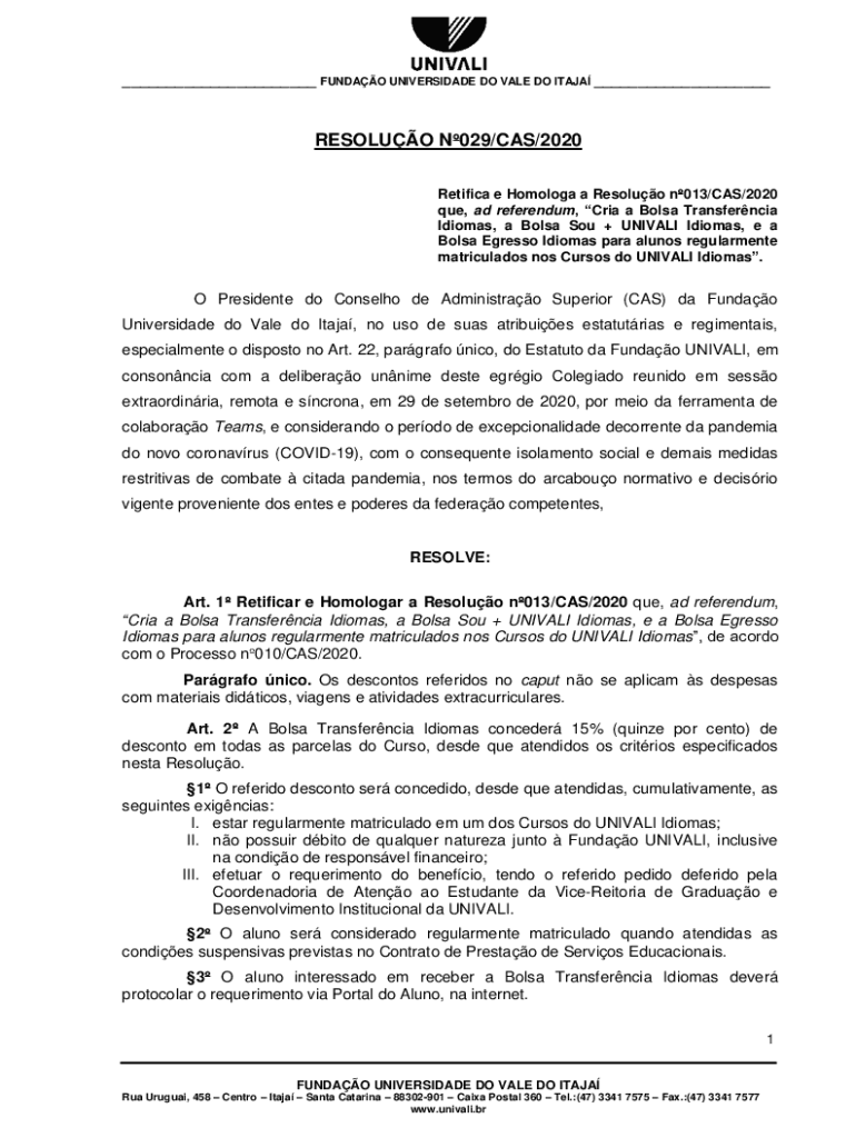 ___ FUND AO UNIVERSIDADE DO VALE DO ITA JA ___RESOLVE N029/CAS/2020 Retiring e Homology a Resolve n013/CAS/2020 Que, ad referendum, CIA a Balsa Transference Idioms, a Balsa Sou + UNIVALVE Idioms,