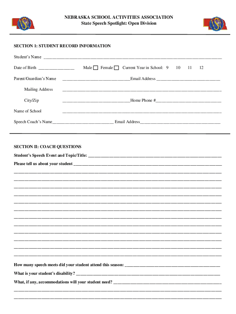 NEBRASKA SCHOOL ACTIVITIES ASSOCIATION State Speech Spotlight: Open DivisionSECTION 1: STUDENT RECORD INFORMATION Students Name ___ Date of Birth ___ Parent/Guardians NameMaleFemaleCurrent Year in