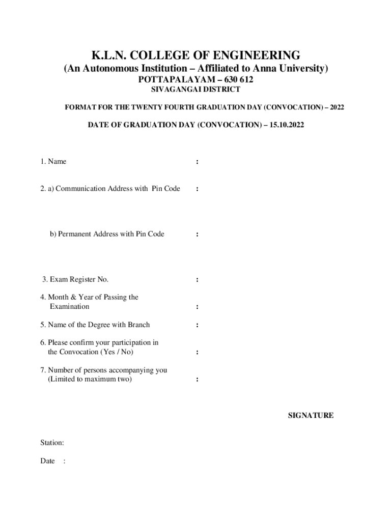 K.L.N. COLLEGE OF ENGINEERING (An Autonomous Institution Affiliated to Anna University) POTTAPALAYAM 630 612 SIVAGANGAI DISTRICT FORMAT FOR THE TWENTY FOURTH GRADUATION DAY (CONVOCATION) 2022DATE