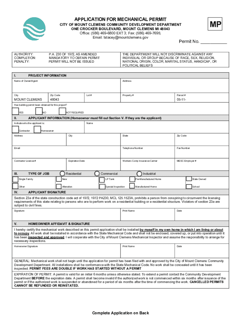 APPLICATION FOR MECHANICAL PERMITTIVITY OF MOUNT CLEMENS COMMUNITY DEVELOPMENT DEPARTMENT ONE CROCKER BOULEVARD, MOUNT CLEMENS MI 48043 Office: (586) 4696800 EXT 3; Fax: (586) 4697695; Email: tstacey@mountclemens.govPermit