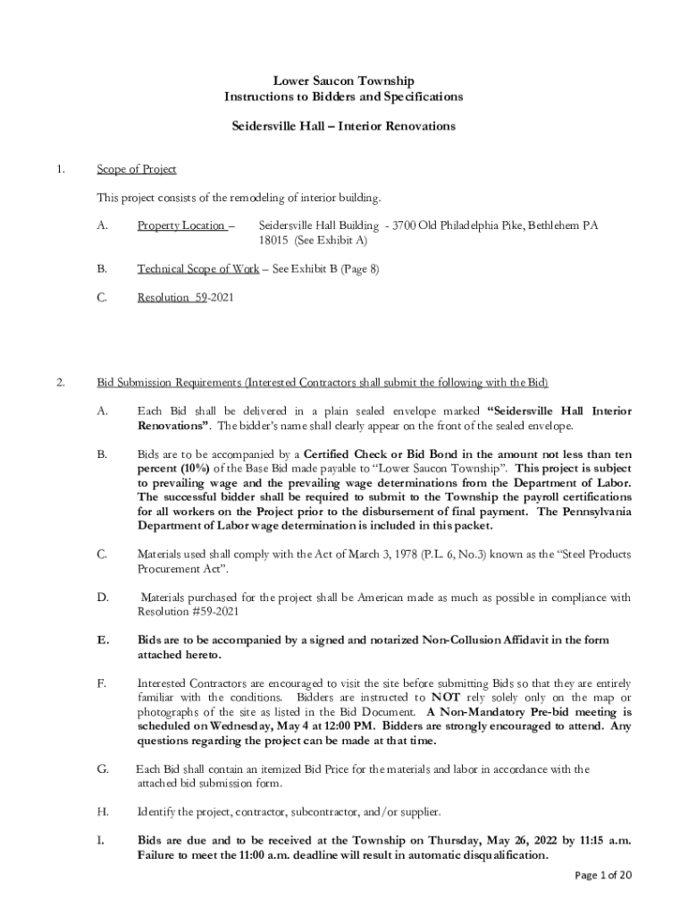 Lower Sauron Township Instructions to Bidders and Specifications Sandersville Hall Interior Renovations 1. Scope of Project This project consists of the remodeling of interior building.2. A. Property