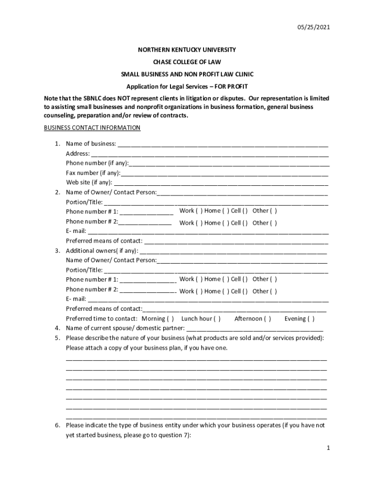05/25/2021 NORTHERN KENTUCKY UNIVERSITY CHASE COLLEGE OF LAW SMALL BUSINESS AND NON PROFIT LAW CLINIC Application for Legal Services FOR PROFIT Note that the SBLC does NOT represent clients in litigation