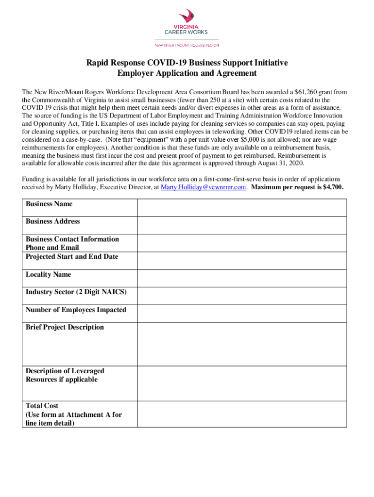 Rapid Response COVID-19 Business Support Initiative Employer Application and Agreement The New River/Mount Rogers Workforce Development Area Consortium Board has been awarded a $61,260 grant from