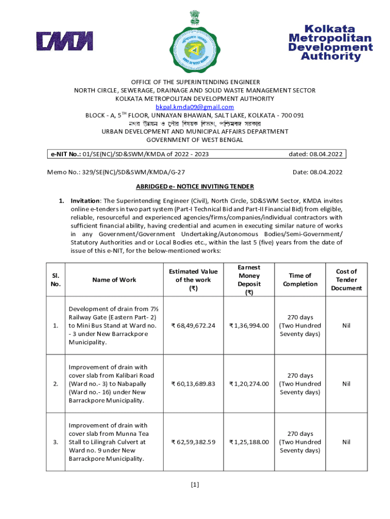 OFFICE OF THE SUPERINTENDING ENGINEER NORTH CIRCLE, SEWERAGE, DRAINAGE AND SOLID WASTE MANAGEMENT SECTOR KOLKATA METROPOLITAN DEVELOPMENT AUTHORITY bkpal.kmda09@gmail.com BLOCK A, 5TH FLOOR, UNNAMED