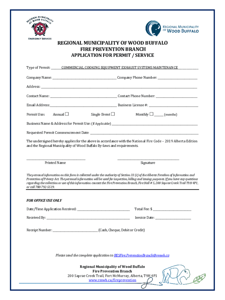 September 19, 2022Regional Municipality of Wood Buffalo Fire Prevention Branch Phone: (780) 792 5519 RESFire.PreventionBranch@rmwb.caRE: PERMIT REQUIRED TO PERFORM WORK ON COMMERCIAL COOKING EQUIPMENT