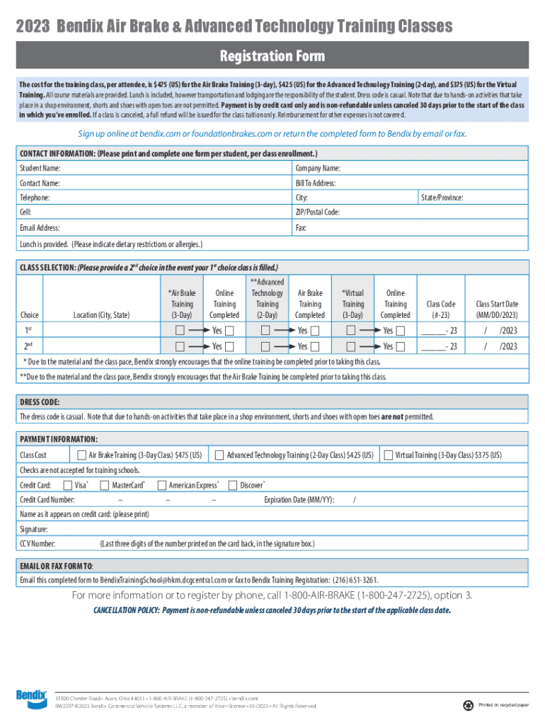 2023 Bendix Air Brake & Advanced Technology Training Classes Registration Form The cost for the training class, per attendee, is $475 (US) for the Air Brake Training (3day), $425 (US) for the Advanced