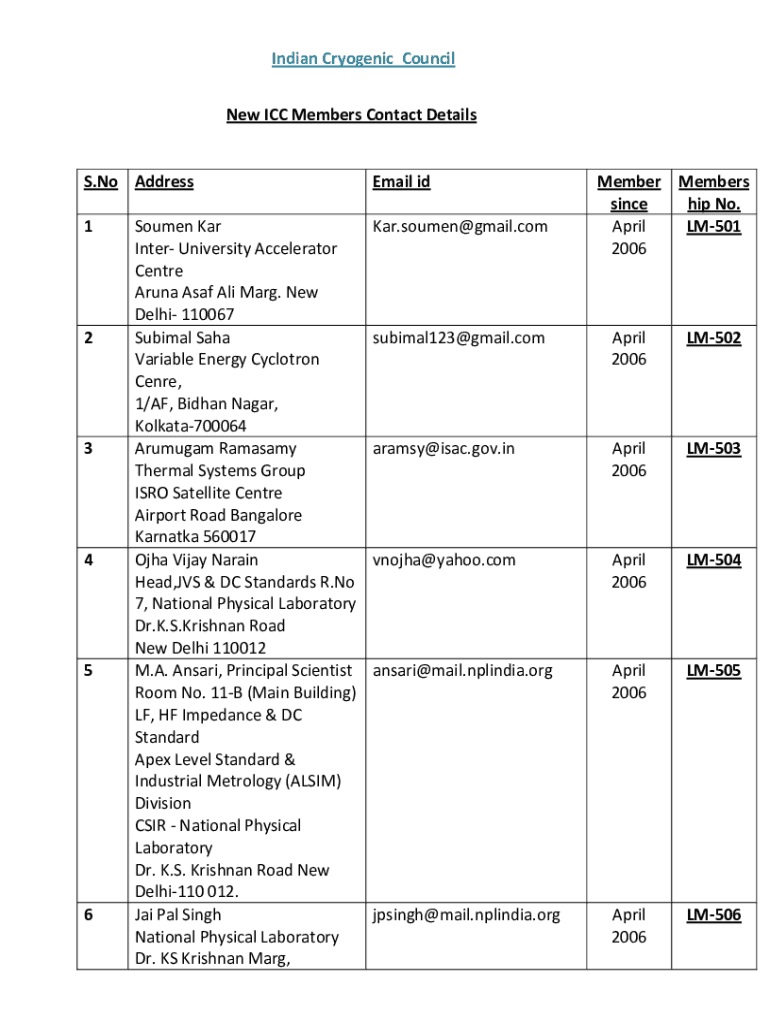 Indian Cryogenic Council New ICC Members Contact Details. No AddressEmail id1Kar.soumen@gmail.com23456Soumen Car Inter University Accelerator Center Arena USAF Ali Mary. New Delhi 110067 Cubical Saga