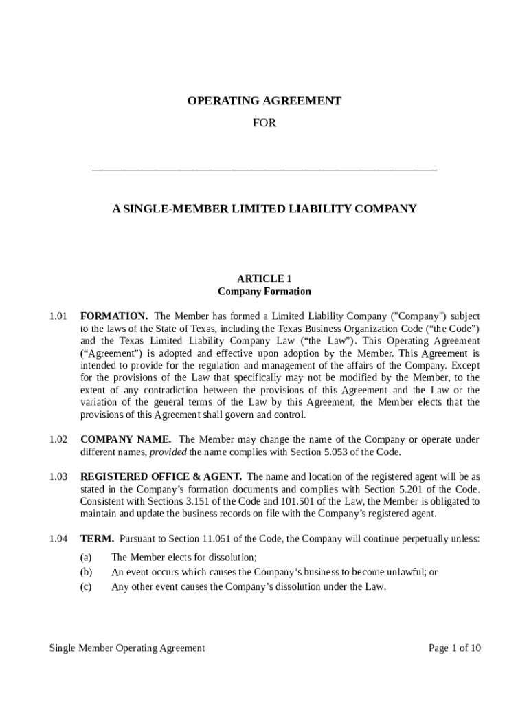 OPERATING AGREEMENT FOR ___ A SINGLEMEMBER LIMITED LIABILITY COMPANYARTICLE 1 Company Formation 1.01FORMATION. The Member has formed a Limited Liability Company (\” Company\”) subject to the laws