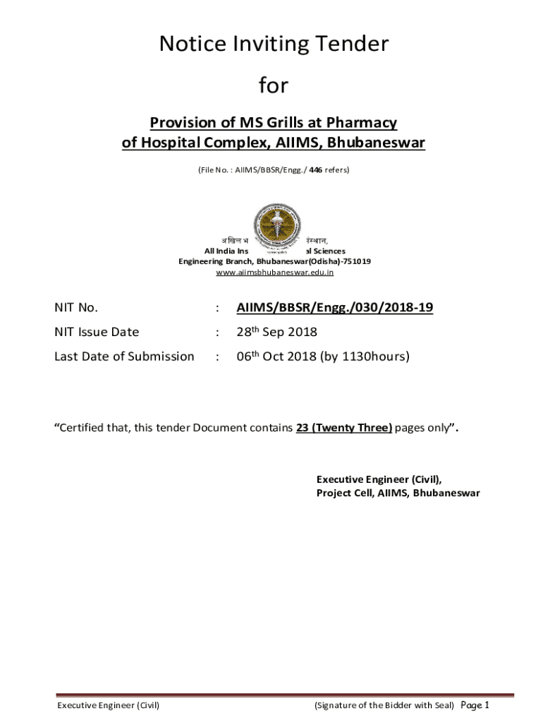 Notice Inviting Tender provision of MS Grills at Pharmacy of Hospital Complex, AIMS, Bhubaneswar (File No. AIMS/BBS/Egg./ 446 refers), All India Institute of Medical Sciences Engineering Branch, Bhubaneswar(Odisha)751019