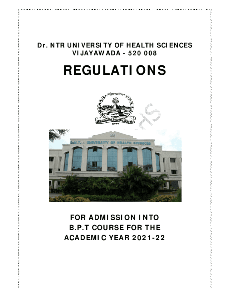Dr. NTR UNIVERSITY OF HEALTH SCIENCES VIJAYAWADA 520 008REGULATIONSFOR ADMISSION INTO B.P.T COURSE FOR THE ACADEMIC YEAR 202122IMPORTANT DATES AND INFORMATIONNoItemDate & Time1. Publication of notification