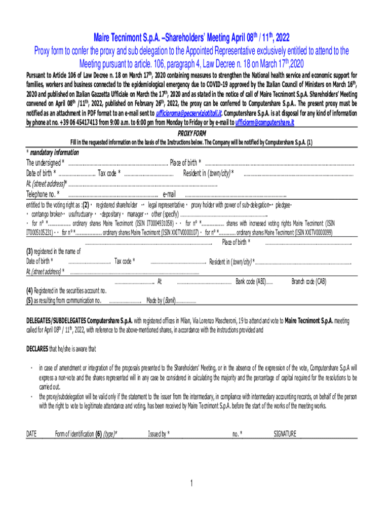 Maine Testimony S.p.A. Shareholders Meeting April 08th / 11th, 2022 Proxy form to confer the proxy and sub delegation to the Appointed Representative exclusively entitled to attend to the Meeting