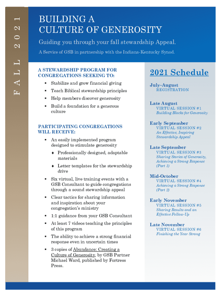2 0 2 1 F A LL BUILDING A CULTURE OF GENEROSITY Guiding you through your fall stewardship Appeal. A Service of GB in partnership with the Indiana Kentucky Synod. A STEWARDSHIP PROGRAM FOR CONGREGATIONS