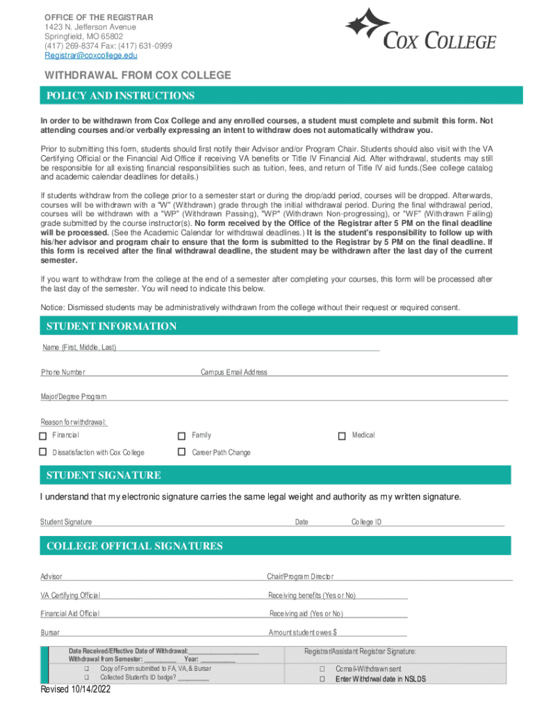OFFICE OF THE REGISTRAR 1423 N. Jefferson Avenue Springfield, MO 65802 (417) 2698374 Fax: (417) 6310999 Registrar@coxcollege.eduWITHDRAWAL FROM COX COLLEGE POLICY AND INSTRUCTIONS In order to be withdrawn