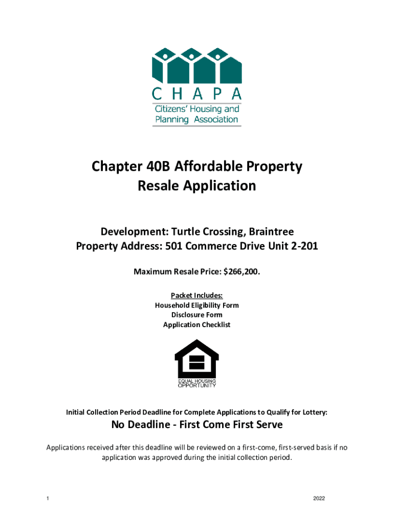 Chapter 40B Affordable Property Resale Application Development: Turtle Crossing, Braintree Property Address: 501 Commerce Drive Unit 2201 Maximum Resale Price: $266,200. Packet Includes: Household