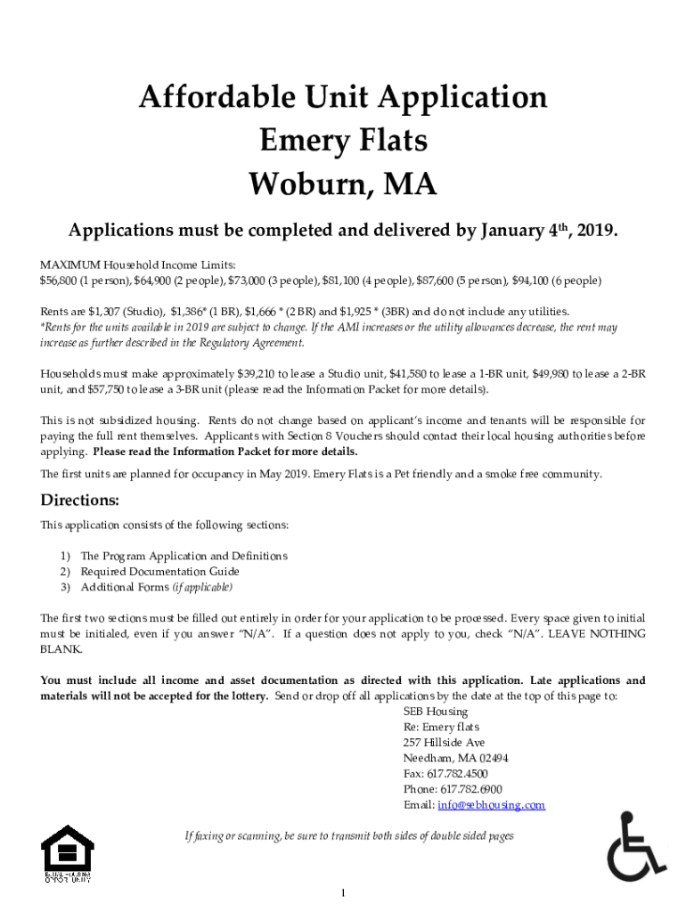 Affordable Unit Application Emery Flats Woburn, MA Applications must be completed and delivered by January 4th, 2019. MAXIMUM Household Income Limits: $56,800 (1 person), $64,900 (2 people), $73,000