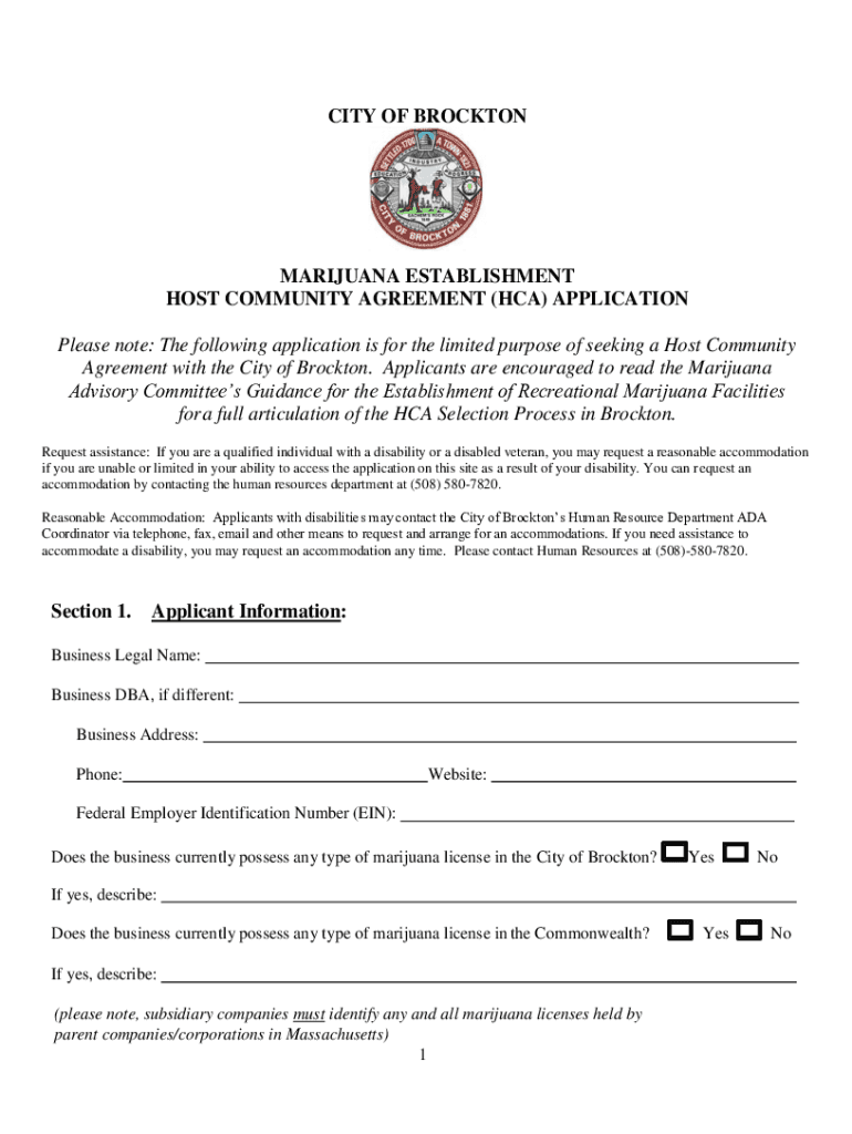 CITY OF BROCKTONMARIJUANA ESTABLISHMENT HOST COMMUNITY AGREEMENT (HCA) APPLICATION Please note: The following application is for the limited purpose of seeking a Host Community Agreement with the