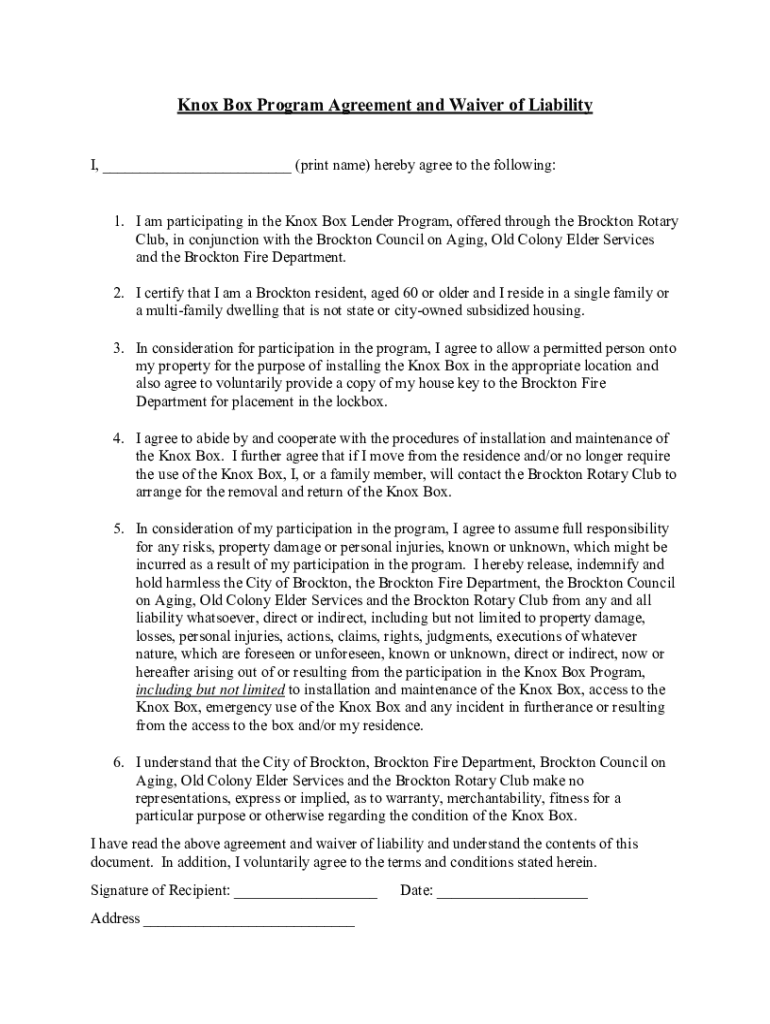 Knox Box Program Agreement and Waiver of Liability I, ___ (print name) hereby agree to the following:1. I am participating in the Knox Box Lender Program, offered through the Brockton Rotary Club,