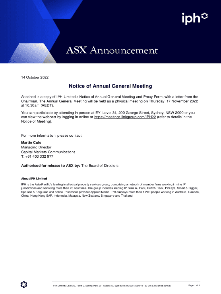 ASX Announcement 14 October 2022Notice of Annual General Meeting Attached is a copy of MPH Limited Notice of Annual General Meeting and Proxy Form, with a letter from the Chairman. The Annual General