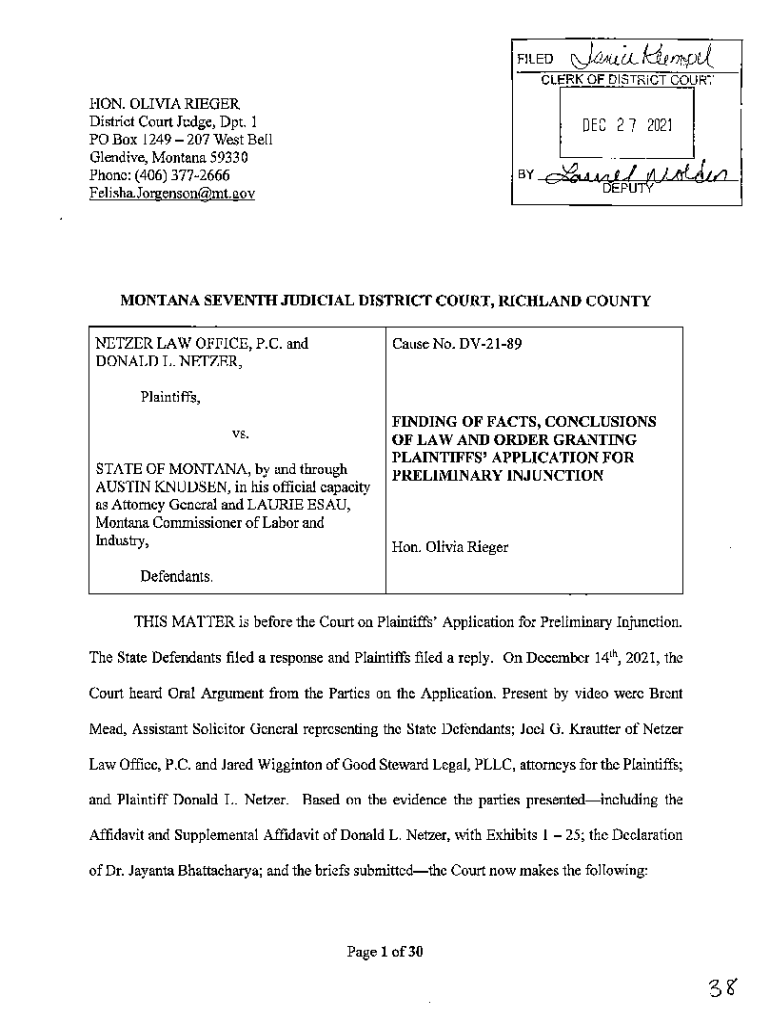 Arguments on the Plaintiffs' application for a preliminary injunction on December 14, 2021. FINDINGS OF FACT 1 1. During the 2021 Legislative session, the State of Montana enacted House Bill 702,