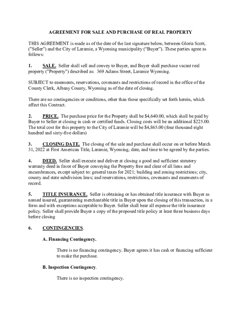 AGREEMENT FOR SALE AND PURCHASE OF REAL PROPERTY THIS AGREEMENT is made as of the date of the last signature below, between Gloria Scott, (\” Seller\”) and the City of Laramie, a Wyoming municipality