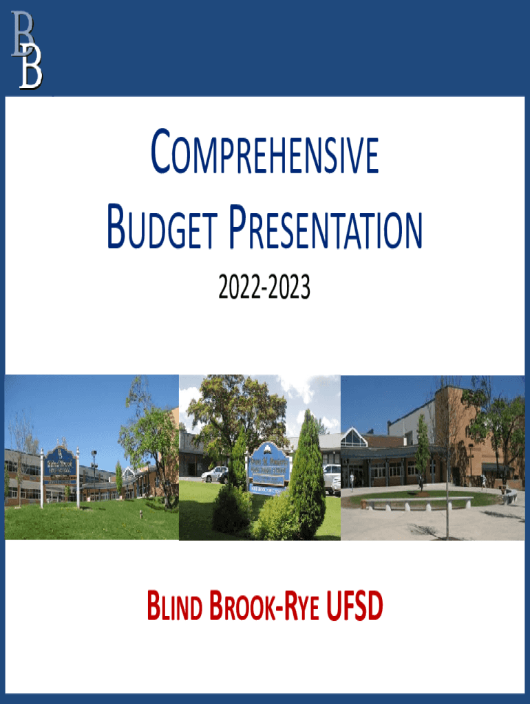 COMPREHENSIVE BUDGET PRESENTATION 20222023BLIND BROOKLYN UFSDTodays Budget Discussion Items School Budget Review Process Review of Budget Goals Review of Tax Levy Cap Expenditure & Revenue Summary